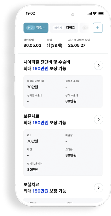 내 치료비는 물론, 부모님·아이 보험까지 어떤 보험에서 얼마까지 보장되는지 한 번에 확인 하고, 가족 전체의 보험을 한 화면에서 관리하도록 도와줍니다.