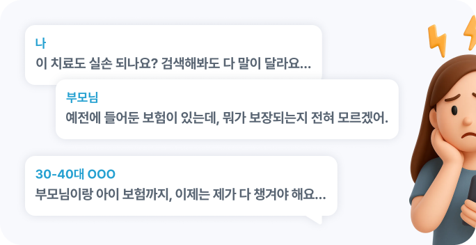 부모님·자녀 보험까지 함께 확인해야 해서각 보험의 조건을 비교하고 정리하는 데시간과 에너지가 많이 드는 보호자.